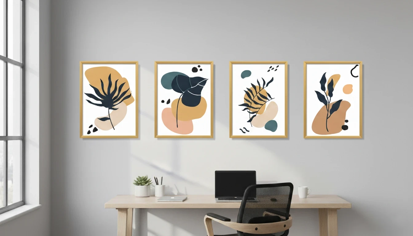 This set of four minimalist art prints brings a touch of modern, organic elegance to any space. Each piece features a unique, abstract botanical design with flowing, natural shapes in a calming palette of earthy tones, including mustard, teal, and blush. The clean lines and serene colors make this collection a perfect addition to a living room, bedroom, or office, creating a peaceful and sophisticated atmosphere. Available Sizes: • A1: 20x30 inches • A2: 16x24 inches • A3: 12x18 inches • A4: 9x12 inches Materials • Frame: High-quality PVC • Paper: Luster • Front: Transparent Acrylic Glass • Back: 3.18mm hardboard wood • Hooks: Pre-installed for easy hanging Packaging Each frame is carefully protected with bubble wrap to prevent scratches and then secured in a sturdy cardboard box, ensuring it arrives at your door in perfect condition.