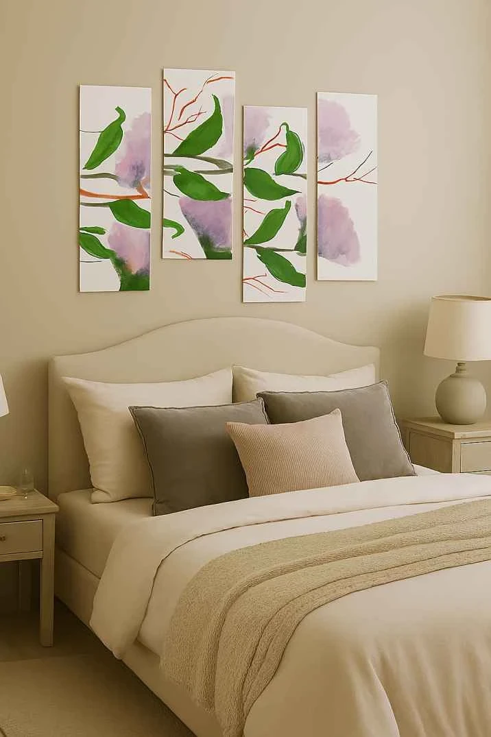 This stunning set of four abstract floral art prints brings a touch of modern, serene elegance to any space. Each panel features a continuous, flowing design of delicate lilac flowers and vibrant green leaves, creating a peaceful and harmonious atmosphere. The unique split-panel design makes it a captivating focal point for a bedroom, living room, or dining area, seamlessly blending nature-inspired art with contemporary style.