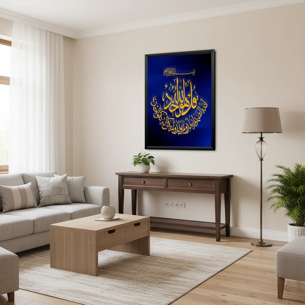 This breathtaking art print features the complete text of Surah Al-Ikhlas (Chapter of Sincerity) from the Quran, rendered in a magnificent, glowing calligraphic style. The brilliant golden-yellow script appears to radiate light against a deep, vibrant royal blue background, creating a profound and luxurious spiritual focal point. This piece is perfect for adding elegance, reverence, and a daily reminder of faith to a living room, prayer space, or entryway.