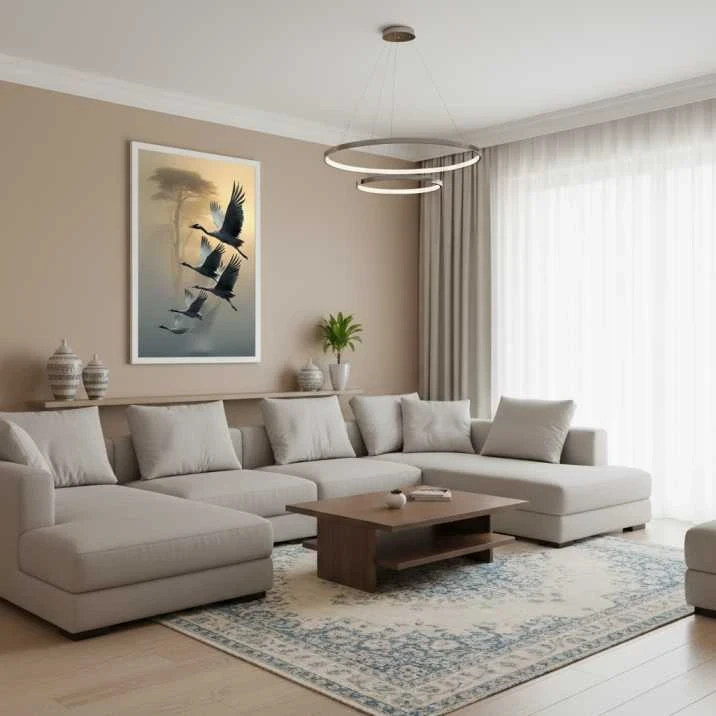 This striking art print captures the serene beauty of cranes in flight against a misty, ethereal sky. The graceful birds are silhouetted, creating a powerful sense of movement and freedom. The soft, faded background of a tree and subtle colors adds depth and a tranquil atmosphere to the scene. This elegant piece is perfect for adding a touch of peaceful nature and sophistication to any living room, bedroom, or office.