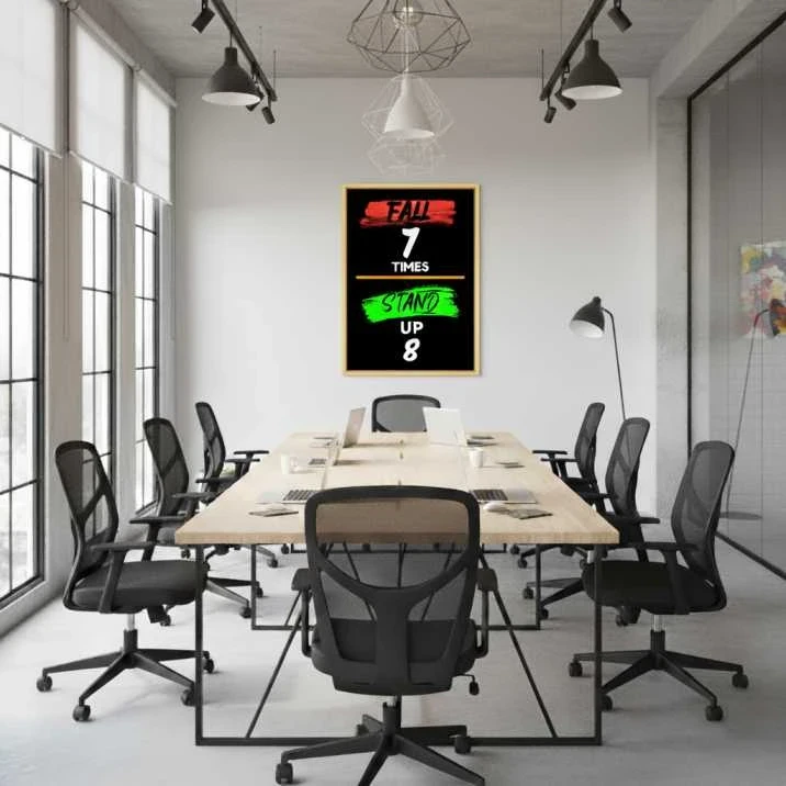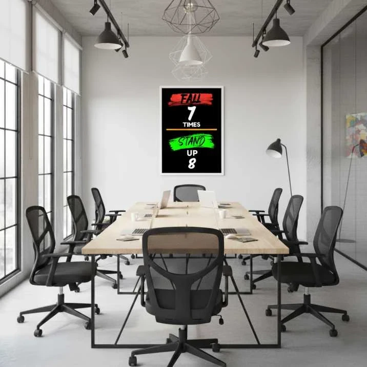 This powerful art print serves as a bold and inspiring reminder of resilience and perseverance. The phrase "FALL 7 TIMES STAND UP 8" is prominently featured in a striking design with a vibrant red and green color palette, set against a sleek black background. This minimalist yet impactful piece is perfect for an office, gym, or study, providing a daily dose of motivation and encouraging a growth-oriented mindset.