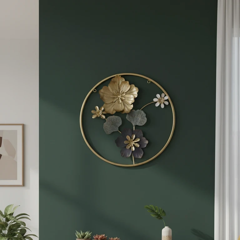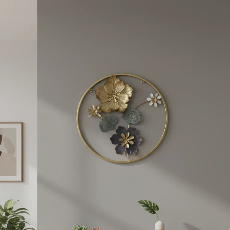 Introduce a touch of contemporary elegance and artistic flair to your home with this stunning Modern Round 3D Floral Metal Wall Art. This captivating piece features an asymmetrical arrangement of dimensional flowers and leaves, all gracefully framed within a sleek golden circle.