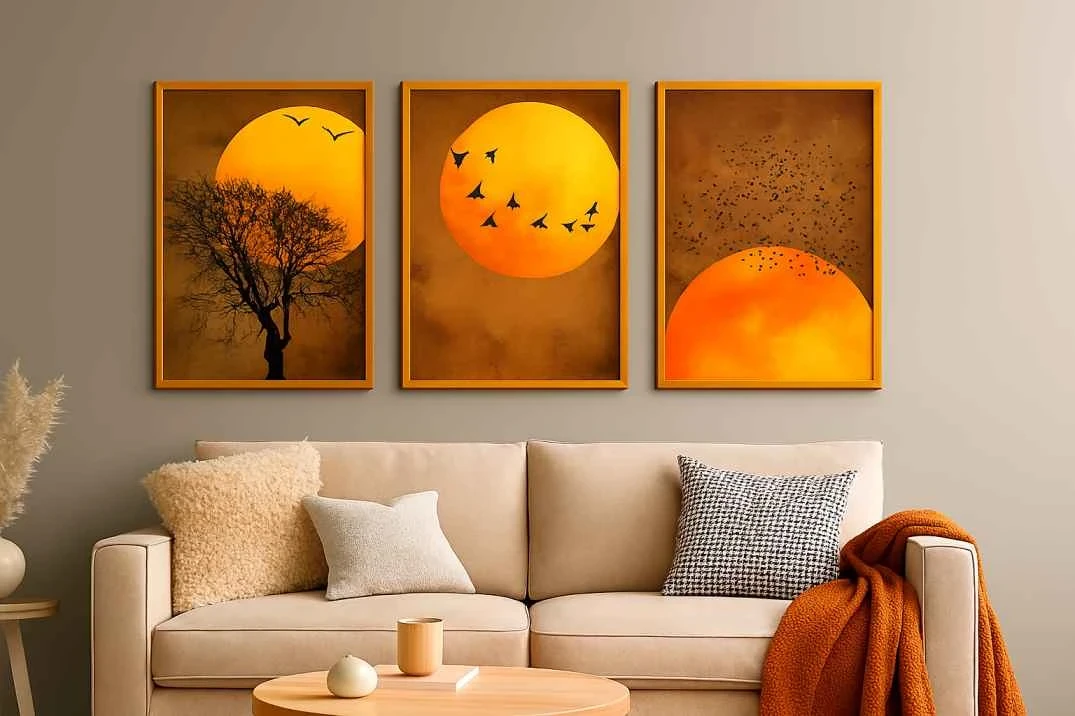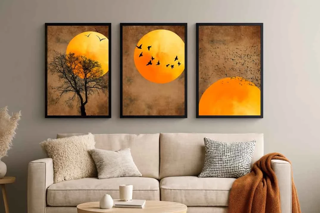 This stunning set of three art prints captures a serene sunset scene in a unique and captivating way. Each print combines to form a panoramic view of a large, glowing orange sun, silhouetted by a gnarled tree and a flock of birds taking flight. The warm, rustic tones and textured background create a sense of peaceful natural beauty, making this set a perfect addition to a living room, bedroom, or entryway.