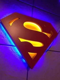 Experience the power of the Man of Steel with this spectacular backlit wooden Superman logo. This isn't just a sign; it's a piece of art that illuminates your space with an incredible dual-light effect. The iconic "S" shield is cut from wood and finished in matte black. Inside, a warm yellow/orange light gives the classic emblem its heroic glow. Surrounding the whole piece is a vibrant blue backlighting that casts a brilliant, Kryptonian-inspired halo onto your wall. Measuring a commanding 32" wide x 9" high, it's the ultimate collectible for any DC or superhero enthusiast.